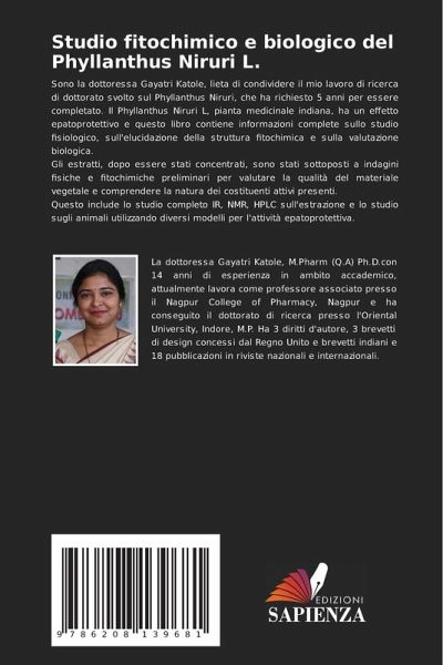 Sono la dottoressa Gayatri Katole, lieta di condividere il mio lavoro di ricerca di dottorato svolto sul Phyllanthus Niruri, che ha richiesto 5 anni per essere completato. Il Phyllanthus Niruri L, pianta medicinale indiana, ha un effetto epatoprotettivo e questo libro contiene informazioni complete sullo studio fisiologico, sull'elucidazione della struttura fitochimica e sulla valutazione biologica.Gli estratti, dopo essere stati concentrati, sono stati sottoposti a indagini fisiche e fitochimiche preliminari per valutare la qualità del materiale vegetale e comprendere la natura dei costituenti attivi presenti.Questo include lo studio completo IR, NMR, HPLC sull'estrazione e lo studio sugli animali utilizzando diversi modelli per l'attività epatoprotettiva.