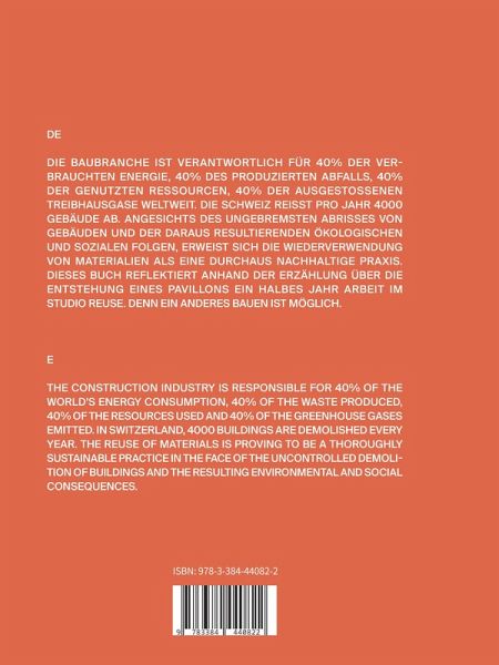 Die Baubranche ist verantwortlich für 40% der verbrauchten Energie, 40% des produzierten Abfalls, 40% der genutzten Ressourcen, 40% der ausgestossenen Treibhausgase Weltweit. Die Schweiz reisst pro Jahr 4000 Gebäude ab. Angesichts des ungebremsten Abrisses von Gebäuden und der daraus resultierenden ökologischen und sozialen Folgen, erweist sich die Wiederverwendung von Materialien als eine durchaus nachhaltige Praxis. Dieses Buch reflektiert anhand der Erzählung über die Entstehung eines Pavillons ein halbes Jahr Arbeit im Studio Reuse. Denn ein anderes Bauen ist möglich.