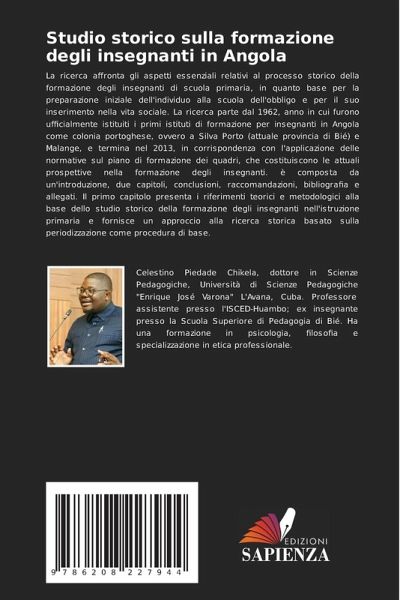 La ricerca affronta gli aspetti essenziali relativi al processo storico della formazione degli insegnanti di scuola primaria, in quanto base per la preparazione iniziale dell'individuo alla scuola dell'obbligo e per il suo inserimento nella vita sociale. La ricerca parte dal 1962, anno in cui furono ufficialmente istituiti i primi istituti di formazione per insegnanti in Angola come colonia portoghese, ovvero a Silva Porto (attuale provincia di Bié) e Malange, e termina nel 2013, in corrispondenza con l'applicazione delle normative sul piano di formazione dei quadri, che costituiscono le attuali prospettive nella formazione degli insegnanti. è composta da un'introduzione, due capitoli, conclusioni, raccomandazioni, bibliografia e allegati. Il primo capitolo presenta i riferimenti teorici e metodologici alla base dello studio storico della formazione degli insegnanti nell'istruzione primaria e fornisce un approccio alla ricerca storica basato sulla periodizzazione come procedura di base.