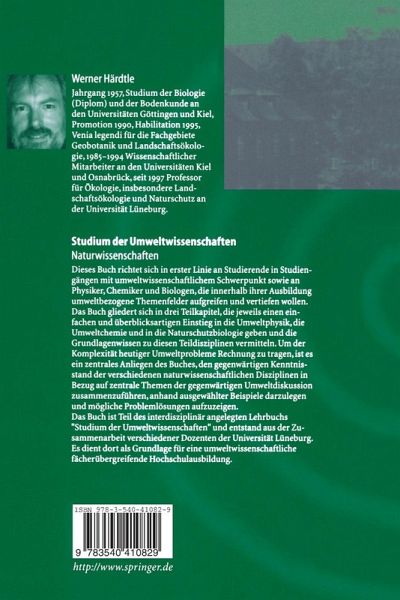 Dieses Buch richtet sich in erster Linie an Studierende in Studiengängen mit umweltwissenschaftlichem Schwerpunkt sowie an Physiker, Chemiker und Biologen, die umweltbezogene Themenfelder aufgreifen und vertiefen wollen. Das Buch gliedert sich in drei Teilkapitel, die einen Einstieg in die Umweltphysik, die Umweltchemie und in die Naturschutzbiologie geben und Grundlagenwissen zu diesen Teildisziplinen vermitteln. Um der Komplexität heutiger Umweltprobleme Rechnung zu tragen, wird in diesem Buch der aktuelle Kenntnisstand der verschiedenen naturwissenschaftlichen Disziplinen zu zentralen Themen der Umweltdiskussion zusammengeführt und anhand ausgewählter Beispiele veranschaulicht. Mögliche Problemlösungen werden aufgezeigt. Das Buch ist Teil des interdisziplinär angelegten Lehrbuchs Studium der Umweltwissenschaften und entstand aus der Zusammenarbeit verschiedener Dozenten der Universität Lüneburg. Es dient dort als Grundlage für eine fächerübergreifende Hochschulausbildung.