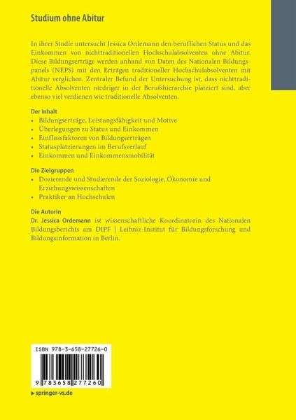 In ihrer Studie untersucht Jessica Ordemann den beruflichen Status und das Einkommen von nichttraditionellen Hochschulabsolventen ohne Abitur. Diese Bildungserträge werden anhand von Daten des Nationalen Bildungspanels (NEPS) mit den Erträgen traditioneller Hochschulabsolventen mit Abitur verglichen. Zentraler Befund der Untersuchung ist, dass nichttraditionelle Absolventen niedriger in der Berufshierarchie platziert sind, aber ebenso viel verdienen wie traditionelle Absolventen.