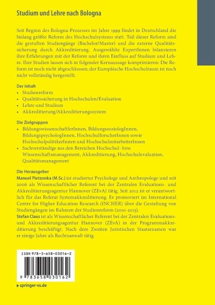 Manuel Pietzonka (M.Sc.) ist studierter Psychologe und Anthropologe und seit 2006 als Wissenschaftlicher Referent bei der Zentralen Evaluations- und Akkreditierungsagentur Hannover (ZEvA) tätig. Seit 2012 ist er verantwortlich für das Referat Systemakkreditierung. Er promoviert im International Centre for Higher Education Research (INCHER) über die Gestaltung von Studiengängen im Rahmen der Studienreform (2010-2013). Stefan Claus ist als Wissenschaftlicher Referent bei der Zentralen Evaluations- und Akkreditierungsagentur Hannover (ZEvA) in der Programmakkreditierung beschäftigt. Nach dem Zweiten Juristischen Staatsexamen war er einige Jahre als Rechtsanwalt tätig.