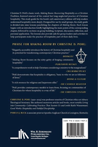Christine D. Pohl's book Making Room: Recovering Hospitality as a Christian Tradition has helped foster renewal of the central but long-neglected practice of Christian hospitality. This new study guide for Making Room provides a variety of ways in which people can learn more about the practice. Designed for use by small groups -- though individuals will also profit from it -- the study guide is divided into nine lessons corresponding to the chapters of Making Room. Each lesson begins with an introduction briefly highlighting the main points of the book, followed by sections on group building, Scripture, discussion, reflection, and personal application. Each lesson also provides aids for group leaders and suggested activities to help participants begin to make the practice of hospitality part of their daily life.