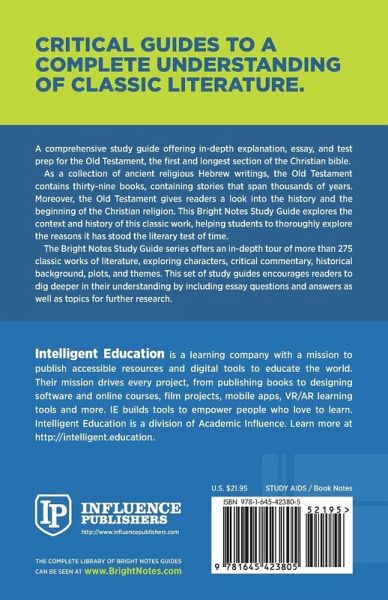 A comprehensive study guide offering in-depth explanation, essay, and test prep for the Old Testament, the first and longest section of the Christian bible. As a collection of ancient religious Hebrew writings, the Old Testament contains thirty-nine books, containing stories that span thousands of years. Moreover, the Old Testament gives readers a look into the history and the beginning of the Christian religion. This Bright Notes Study Guide explores the context and history of this classic work, helping students to thoroughly explore the reasons it has stood the literary test of time. Each Bright Notes Study Guide contains: - Introductions to the Author and the Work - Character Summaries - Plot Guides - Section and Chapter Overviews - Test Essay and Study Q&As The Bright Notes Study Guide series offers an in-depth tour of more than 275 classic works of literature, exploring characters, critical commentary, historical background, plots, and themes. This set of study guides encourages readers to dig deeper in their understanding by including essay questions and answers as well as topics for further research.