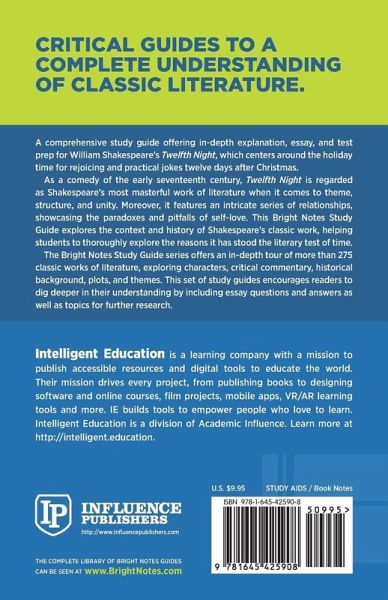 A comprehensive study guide offering in-depth explanation, essay, and test prep for William Shakespeare's Twelfth Night, which centers around the holiday time for rejoicing and practical jokes twelve days after Christmas. As a comedy of the early-seventeenth-century, Twelfth Night is regarded as Shakespeare's most masterful work of literature when it comes to theme, structure, and unity. Moreover, it shows an intricate series of relationships showcasing the paradoxes and pitfalls of self-love. This Bright Notes Study Guide explores the context and history of Shakespeare's classic work, helping students to thoroughly explore the reasons it has stood the literary test of time. Each Bright Notes Study Guide contains: - Introductions to the Author and the Work - Character Summaries - Plot Guides - Section and Chapter Overviews - Test Essay and Study Q&As The Bright Notes Study Guide series offers an in-depth tour of more than 275 classic works of literature, exploring characters, critical commentary, historical background, plots, and themes. This set of study guides encourages readers to dig deeper in their understanding by including essay questions and answers as well as topics for further research.