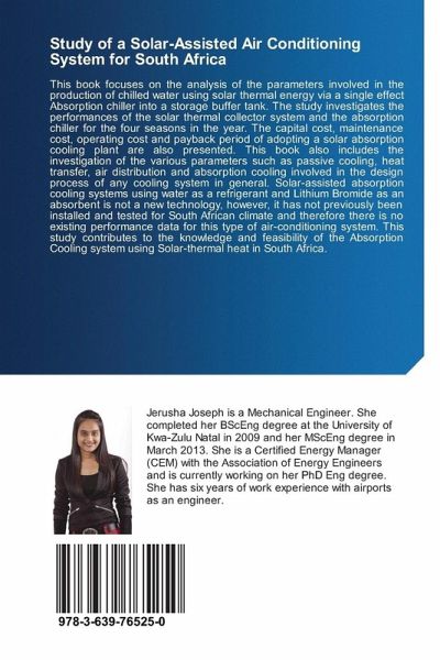 This book focuses on the analysis of the parameters involved in the production of chilled water using solar thermal energy via a single effect Absorption chiller into a storage buffer tank. The study investigates the performances of the solar thermal collector system and the absorption chiller for the four seasons in the year. The capital cost, maintenance cost, operating cost and payback period of adopting a solar absorption cooling plant are also presented. This book also includes the investigation of the various parameters such as passive cooling, heat transfer, air distribution and absorption cooling involved in the design process of any cooling system in general. Solar-assisted absorption cooling systems using water as a refrigerant and Lithium Bromide as an absorbent is not a new technology, however, it has not previously been installed and tested for South African climate and therefore there is no existing performance data for this type of air-conditioning system. This study contributes to the knowledge and feasibility of the Absorption Cooling system using Solar-thermal heat in South Africa.