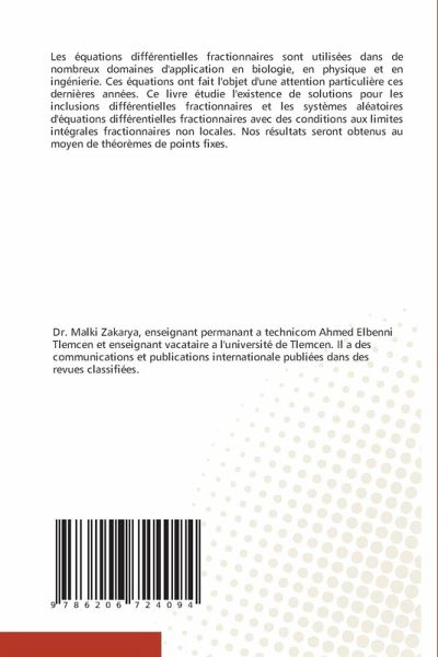 Les équations différentielles fractionnaires sont utilisées dans de nombreux domaines d'application en biologie, en physique et en ingénierie. Ces équations ont fait l'objet d'une attention particulière ces dernières années. Ce livre étudie l'existence de solutions pour les inclusions différentielles fractionnaires et les systèmes aléatoires d'équations différentielles fractionnaires avec des conditions aux limites intégrales fractionnaires non locales. Nos résultats seront obtenus au moyen de théorèmes de points fixes.