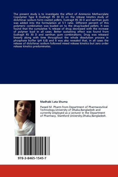 The present study is to investigate the effect of Ammonio Methacrylate Copolymer Type B (Eudragit RS 30 D) on the release kinetics study of diclofenac sodium form coated pellets. Eudragit RS 30 D and xanthan gum was added into the formulation at 5:1 ratio. Different percent of this polymeric combination was loaded on to the drug-loaded pellets. It was found that the cumulative % release of drug decreased with the increase of polymer load in all cases. Better sustaining effect was found from Eudragit RS 30 D and xanthan gum combinations. Drug was released linearly along with time throughout the whole dissolution process in phosphate buffer (pH 6.8) and it was also revealed that, in all cases the release of diclofenac sodium followed mixed release kinetics but zero order release kinetics predominates.