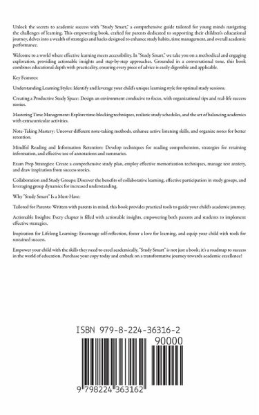 Unlock academic success and empower your child with "Study Smart," the ultimate guide for young minds facing the challenges of learning. Tailored for parents dedicated to supporting their children's educational journey, this book delves into a wealth of strategies and hacks designed to enhance study habits, time management, and overall academic performance. **Results from reading this book:** - Discover effective learning techniques tailored to your child's unique learning style - Create a productive study space and develop time management skills for academic success **Key Features:** - **Understanding Learning Styles:** Identify and leverage your child's unique learning style for optimal study sessions. - **Creating a Productive Study Space:** Design an environment conducive to focus, with organizational tips and real-life success stories. - **Mastering Time Management:** Explore time-blocking techniques, realistic study schedules, and the art of balancing academics with extracurricular activities. - **Note-Taking Mastery:** Uncover different note-taking methods, enhance active listening skills, and organize notes for better retention. - **Mindful Reading and Information Retention:** Develop techniques for reading comprehension, strategies for retaining information, and effective use of annotations and summaries. - **Exam Prep Strategies:** Create a comprehensive study plan, employ effective memorization techniques, manage test anxiety, and draw inspiration from success stories. - **Collaboration and Study Groups:** Discover the benefits of collaborative learning, effective participation in study groups, and leveraging group dynamics for increased understanding. **Why "Study Smart" Is a Must-Have:** - **Tailored for Parents:** Written with parents in mind, this book provides practical tools to guide your child's academic journey. - **Actionable Insights:** Every chapter is filled with actionable insights, empowering both parents and students to implement effective strategies. - **Inspiration for Lifelong Learning:** Encourage self-reflection, foster a love for learning, and equip your child with tools for sustained success. Buy now and unlock your child's academic potential with "Study Smart." This book is not just a guide; it's a roadmap to success. Don't wait - purchase your copy today and embark on a transformative journey towards academic excellence.