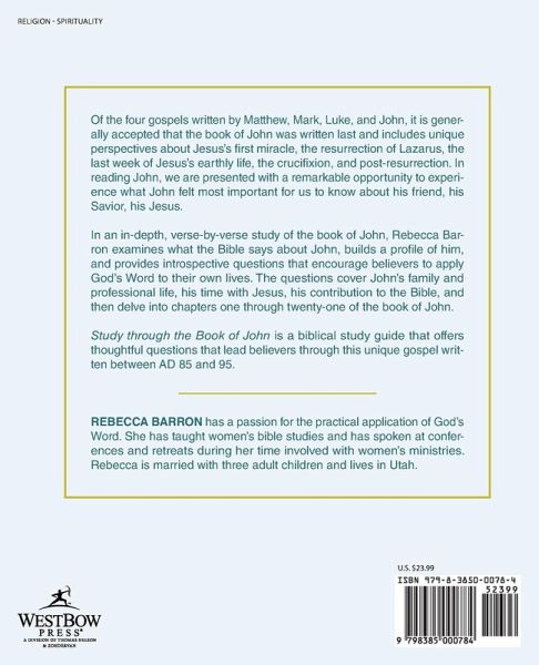 Of the four gospels written by Matthew, Mark, Luke, and John, it is generally accepted that the book of John was written last and includes unique perspectives about Jesus's first miracle, the resurrection of Lazarus, the last week of Jesus's earthly life, the crucifixion, and post-resurrection. In reading John, we are presented with a remarkable opportunity to experience what John felt most important for us to know about his friend, his Savior, his Jesus. In an in-depth, verse-by-verse study of the book of John, Rebecca Barron examines what the Bible says about John, builds a profile of him, and provides introspective questions that encourage believers to apply God's Word to their own lives. The questions cover John's family and professional life, his time with Jesus, his contribution to the Bible, and then delve into chapters one through twenty-one of the book of John. Study through the Book of John is a biblical study guide that offers thoughtful questions that lead believers through this unique gospel written between AD 85 and 95.