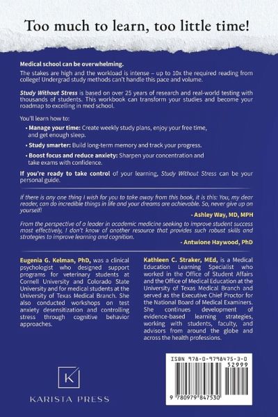 Too much to learn, too little time! Medical school can be overwhelming. The stakes are high and the workload is intense - up to 10x the required reading from college! Undergrad study methods can't handle this pace and volume. Study Without Stress is based on over 25 years of research and real-world testing with thousands of students. This workbook can transform your studies and become your roadmap to excelling in med school. You'll learn how to:Manage Your Time: Create weekly study plans, enjoy your free time, and get enough sleep. Study Smarter: Build long-term memory and track your progress. Boost Focus and Reduce Anxiety: Sharpen your concentration and take exams with confidence. If you're ready to take control of your learning, Study Without Stress can be your personal guide.