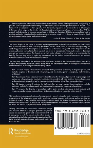 The purpose of this textbook is to introduce beginning researchers to the study of policy making, how it has been examined from a scholarly perspective, and the salient issues to consider in conceptualizing and conducting policy research.