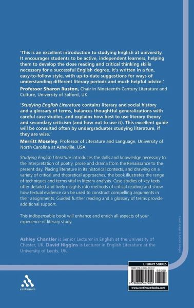 Studying English Literature offers a link between pre-degree study and undergraduate study by introducing students to: - the history of English literature from the Renaissance to the present; - the key literary genres (poetry, prose, and drama); - a range of techniques, tools and terms useful in the analysis of literature; - critical and theoretical approaches to literature. It is designed to improve close critical reading skills and evidence-based discussion; encourage reflection on texts' themes, issues and historical contexts; and demonstrate how criticism and literary theories enable richer and more nuanced interpretations. This one-stop resource for beginning students combines a historical survey of English literature with a practical introduction to the main forms of literary writing. Case studies of key texts offer practical demonstrations of the tools and approaches discussed. Guided further reading and a glossary of terms used provide further support for the student. Introducing a wide range of literary writing, this is an indispensable guide for any student beginning their study of English Literature, providing the tools, techniques, approaches and terminology needed to succeed at university.