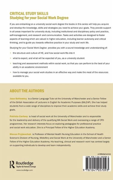 Pat Cartney is Head of Social Work in the School of Health Sciences Division of Nursing, Midwifery and Social Work at the University of Manchester. She is a Principal Fellow of the Higher Education Academy. Her teaching and research interests focus on exploring how people learn best about professional practice and how they become knowledgeable and skilled social work practitioners. Jane Bottomley is a Senior Language Tutor at the University of Manchester and a Senior Fellow of the British Association of Lecturers in English for Academic Purposes (BALEAP). She has been involved in the development of a number of content-based academic study skills courses at the University of Manchester and has published widely in this field. Steven Pryjmachuk is Professor of Mental Health Nursing Education in the School of Health Science's Division of Nursing, Midwifery and Social Work at the University of Manchester and a Senior Fellow of the Higher Education Academy. His teaching, clinical and research work has centred largely on supporting and facilitating individuals - be they students, patients or colleagues - to develop, learn or care independently. In December 2014, Steven was elected as vice Chair (2015-16) and Chair (2017-18) of Mental Health Nurse Academics UK, an organisation representing 65 Higher Education Institutions providing education and research on mental health nursing.