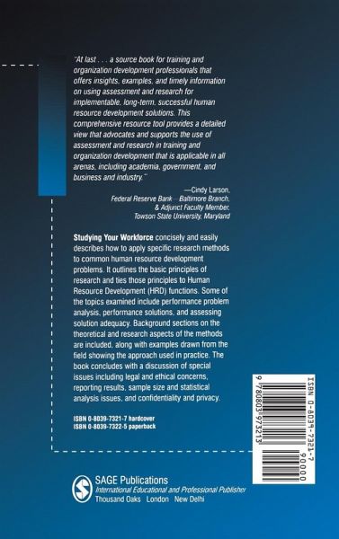 By outlining the basic principles of research and tying them in with human resource development (HRD) functions, this practical guidebook describes how to apply specific research methods to common HRD problems. Topics covered include performance problem analysis, performance solutions and assessing solution adequacy. Background sections on the theoretical and research aspects of the methods are included, with examples drawn from the field showing the approach used in practice. The book concludes with a discussion of special issues including legal and ethical concerns, reporting results, sample size and statistical analysis issues, and confidentiality and privac
