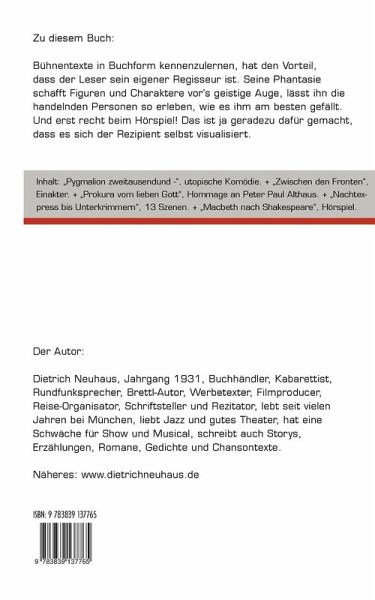 Bühnentexte in Buchform kennenzulernen hat den Vorteil, dass der Leser sein eigener Regisseur ist. In diesem Buch findet man die utopische Komödie "Pygmalion zweitausendund-", den Einakter "Zwischen den Fronten", eine Hommage an den Dichter Peter Paul Althaus "Prokura vom lieben Gott", dreizehn Szenen unter dem Titel "Nachtexpress bis Unterkrimmern" sowie eine Hörspielfassung der Tragödie "Macbeth", frei nach Shakespeare. Es ist der fünfte Sammelband des Autors mit Bühnen- und Hörspieltexten. Näheres: www.dietrichneuhaus.de