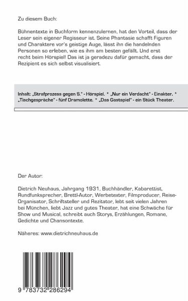 Das Buch enthält drei Bühnenwerke und ein Hörspiel. Im einzelnen:"Tischgespräche", eine Folge von fünf Dramoletten unterschiedlichen Inhalts, aber mit formalen Übereinstimmungen."Das Gastspiel", ein Schauspiel aus der Welt der Bühne."Nur ein Verdacht", die reportagehafte Schilderung einer Epidemie auf einem Kreuzfahrtschiff weitab jedes rettenden Hafens."Strafprozess gegen S.", ein Hörspiel, das im Jahr 399 v.Chr. im alten Athen spielt und einen kritischen Blick auf die junge Demokratie wirft.