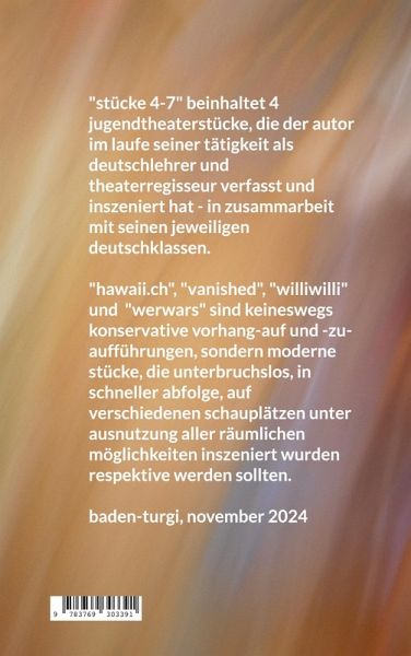 "stücke 4-7" beinhaltet 4 jugendtheaterstücke, die der autor im laufe seiner tätigkeit als deutschlehrer und theaterregisseur verfasst und inszeniert hat - in zusammarbeit mit seinen jeweiligen deutschklassen. der inhalt der stücke basiert einerseits zu 100% auf ideen des autors im rahmen des deutschunterrichts, andereseits aber auch auf anregungen seiner schülerinnen und schüler während der jeweils einjährigen theaterateliers, in denen ein stück erarbeitet, geprobt und schliesslich aufgeführt wurde. sie sind ausschliesslich in schweizerdeutsch abgefasst, also eher dem genre "volkstheater" zuzuordnen. "hawaii.ch", "vanished", "iziba" und "werwars" sind keineswegs konservative vorhang-auf und -zu-aufführungen, sondern moderne stücke, die unterbruchslos, in schneller abfolge, auf verschiedenen schauplätzen unter ausnutzung aller räumlichen möglichkeiten inszeniert wurden respektive werden sollten. baden-turgi, november 2024