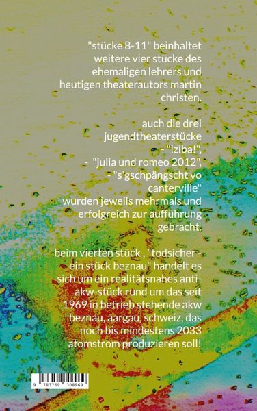 "stücke 8-11" beinhaltet weitere vier stücke des ehemaligen lehrers und heutigen theaterautors martin christen. auch die drei jugendtheaterstücke - "iziba!", - "julia und romeo 2012", - "s'gschpängscht vo canterville" wurden erfolgreich mehrmals vor schülerinnen, schülern und deren eltern aufgeführt, inszeniert vom lehrer und autor martin christen. beim vierten stück , "todsicher - ein stück beznau" handelt es sich um ein realitätsnahes anti-akw-stück rund um das seit 1969 in betrieb stehende akw beznau, aargau, schweiz, das noch bis mindestens 2033 atomstrom produzieren soll!