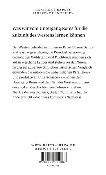 In den letzten drei Jahrhunderten stieg der Westen auf, um den Planeten zu dominieren. Doch plötzlich, um die Jahrtausendwende, kehrte sich die Geschichte um. Angesichts wirtschaftlicher Stagnation und innerer politischer Spaltung befindet sich der Westen in einem rapiden Niedergang. Es ist nicht das erste Mal, dass die globale Ordnung einen solch dramatischen Aufstieg und Fall erlebt. Das Römische Reich folgte einer ähnlichen Entwicklung von überwältigender Macht bis zum Zerfall - eine Tatsache, die mehr ist als ein seltsamer historischer Zufall. In diesem fesselnden Buch nutzen der Historiker Peter Heather und der politische Ökonom John Rapley diese römische Vergangenheit, um über den zeitgenössischen Westen, seinen Zustand der Krise und mögliche Wege heraus neu nachzudenken.