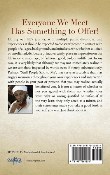 During our life's journey, with multiple paths, directions, and experiences, it should be expected to constantly come in contact with people of all ages, backgrounds, and mindsets, who, whether solicited or unsolicited, deliberate or inadvertently, place an impression on our life in some way, shape, or fashion....good, bad, or indifferent. In any case, it is very likely that although we may not immediately realize it, we are somehow impacted by words, even if merely subconsciously. Perhaps "Stuff People Said to Me", may serve as a catalyst that may trigger memories throughout your own experiences and interaction with people in your past or present, that you may realize, actually benefitted you. It is not a matter of whether or not you agreed with them, nor whether they were right or wrong...justified or unfair...if at the very least, they only acted as a mirror, and their statements made you take a good look at yourself, you win. Just think about it.