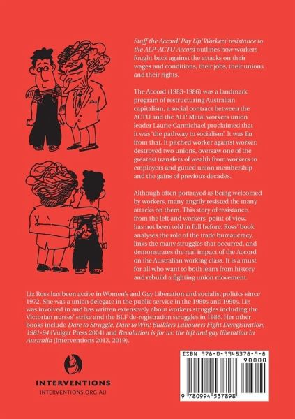 Stuff the Accord! Pay Up! Workers’ resistance to the ALP-ACTU Accord deals with the 1983-1996 ALP-ACTU Accord and outlines how workers fought back against the attacks on their wages and conditions, their jobs, their unions and their rights. The Accord was a landmark program of restructuring Australian capitalism, a social contract between the union peak body, the Australian Council of Trade Unions and the social democratic Australian Labor Party. Earlier the metal workers union leader Laurie Carmichael proclaimed that the Accord was ‘the pathway to socialism’. It was far from that. It pitched worker against worker, destroyed two unions, oversaw one of the greatest transfers of wealth from workers to employers, gutted union membership and the gains of previous decades. While the Accord is generally portrayed as being welcomed by workers, in truth it was an agreement between the union leadership and the ALP, and many workers angrily resisted the many attacks on them. This story of resistance, from the left and workers’ point of view, has not been told in full before. Ross’ book, a left wing take on the Accord years, will link the many struggles and the real impact of the Accord on the Australian working class, as well as an analysis of the trade union leadership’s role.