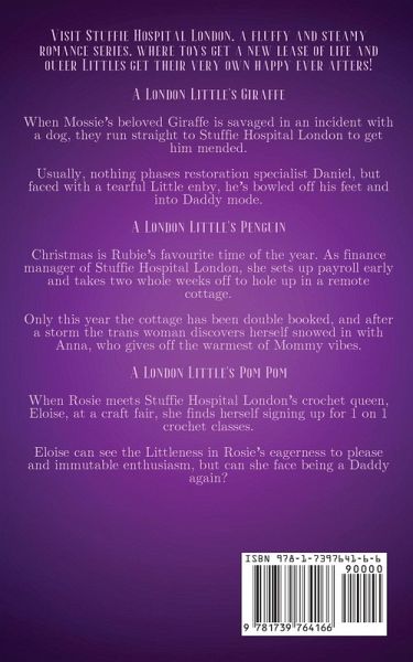 Visit Stuffie Hospital London, a fluffy and steamy romance series, where toys get a new lease of life and queer Littles get their very own happy ever afters! A London Little's Giraffe When Mossie's beloved Giraffe is savaged in an incident with a dog, they run straight to Stuffie Hospital London to get him mended. Usually, nothing phases restoration specialist Daniel, but faced with a tearful Little enby, he's bowled off his feet and into Daddy mode. A London Little's Penguin Christmas is Rubie's favourite time of the year. As finance manager of Stuffie Hospital London, she sets up payroll early and takes two whole weeks off to hole up in a remote cottage. Only this year the cottage has been double booked, and after a storm the trans woman discovers herself snowed in with Anna, who gives off the warmest of Mommy vibes. A London Little's Pom Pom When Rosie meets Stuffie Hospital London's crochet queen, Eloise, at a craft fair, she finds herself signing up for 1 on 1 crochet classes. Eloise can see the Littleness in Rosie's eagerness to please and immutable enthusiasm, but can she face being a Daddy again?