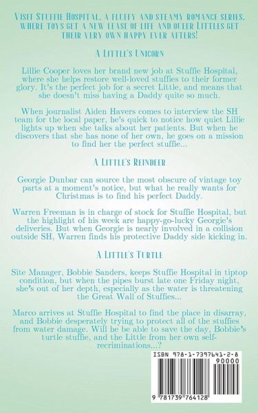 Visit Stuffie Hospital, a fluffy and steamy romance series, where toys get a new lease of life and queer Littles get their very own happy ever afters! A Little's Unicorn Lillie Cooper loves her brand new job at Stuffie Hospital, where she helps restore well-loved stuffies to their former glory. It's the perfect job for a secret Little, and means that she doesn't miss having a Daddy quite so much.¿¿¿ When journalist Aiden Havers comes to interview the SH team for the local paper, he's quick to notice how quiet Lillie lights up when she talks about her patients. But when he discovers that she has none of her own, he goes on a mission to find her the perfect stuffie... A Little's Reindeer ¿¿Georgie Dunbar can source the most obscure of vintage toy parts at a moment's notice, but what he really wants for Christmas is to find his perfect Daddy. Warren Freeman is in charge of stock for Stuffie Hospital, but the highlight of his week are happy-go-lucky Georgie's deliveries. But when Georgie is nearly involved in a collision outside SH, Warren finds his protective Daddy side kicking in. A Little's Turtle Site Manager, Bobbie Sanders, keeps Stuffie Hospital in tiptop condition, but when the pipes burst late one Friday night, she's out of her depth, especially as the water is threatening the Great Wall of Stuffies... Marco arrives at Stuffie Hospital to find the place in disarray, and Bobbie desperately trying to protect all of the stuffies from water damage. Will he be able to save the day, Bobbie's turtle stuffie, and the Little from her own self-recriminations...?