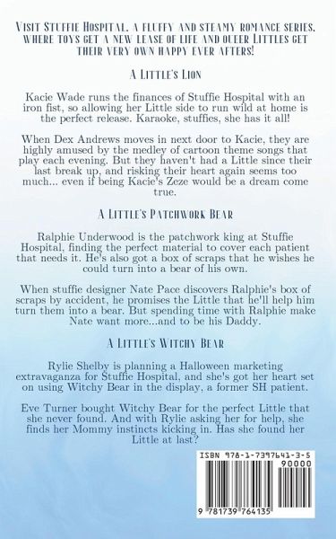 Visit Stuffie Hospital, a fluffy and steamy romance series, where toys get a new lease of life and queer Littles get their very own happy ever afters! A Little's Lion Kacie Wade runs the finances of Stuffie Hospital with an iron fist, so allowing her Little side to run wild at home is the perfect release. Karaoke, stuffies, she has it all! When Dex Andrews moves in next door to Kacie, they are highly amused by the medley of cartoon theme songs that play each evening. But they haven't had a Little since their last break up, and risking their heart again seems too much... even if being Kacie's Zeze would be a dream come true. A Little's Patchwork Bear Ralphie Underwood is the patchwork king at Stuffie Hospital, finding the perfect material to cover each patient that needs it. He's also got a box of scraps that he wishes he could turn into a bear of his own. When stuffie designer Nate Pace discovers Ralphie's box of scraps by accident, he promises the Little that he'll help him turn them into a bear. But spending time with Ralphie make Nate want more...and to be his Daddy. A Little's Witchy Bear Rylie Shelby is planning a Halloween marketing extravaganza for Stuffie Hospital, and she's got her heart set on using Witchy Bear in the display, a former SH patient. Eve Turner bought Witchy Bear for the perfect Little that she never found. And with Rylie asking her for help, she finds her Mommy instincts kicking in. Has she found her Little at last?