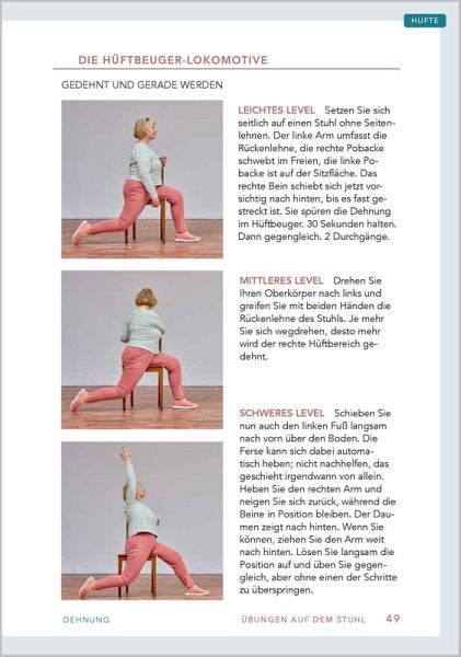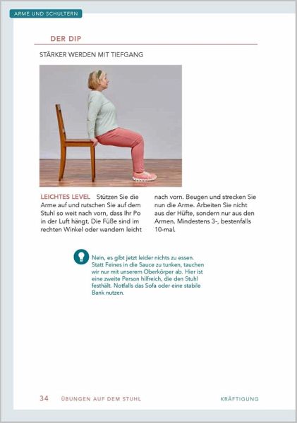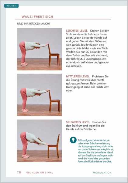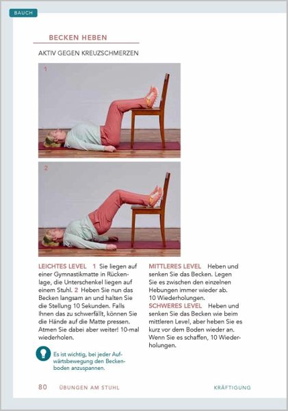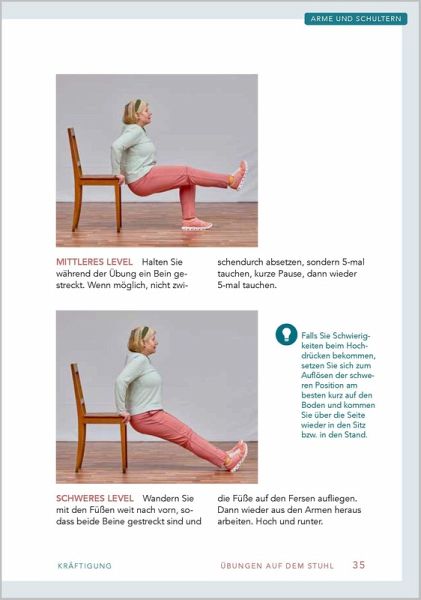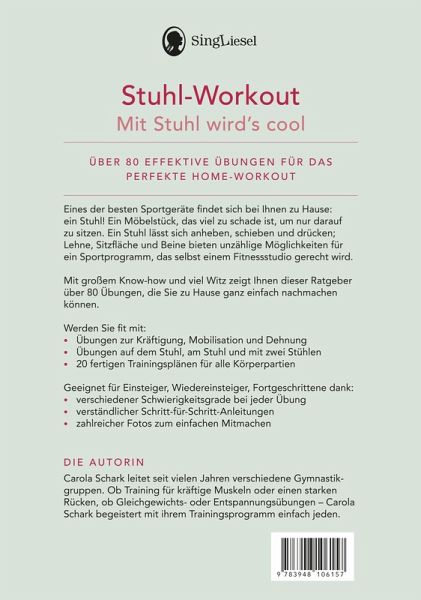 Stuhl-WorkoutMit Stuhl wird's coolÜber 80 effektive Übungen für das perfekte Home-WorkoutEines der besten Sportgeräte findet sich bei Ihnen zu Hause: ein Stuhl! Ein Möbelstück, das viel zu schade ist, um nur daraufzu sitzen. Ein Stuhl lässt sich anheben, schieben und drücken; Lehne, Sitzfläche und Beine bieten unzählige Möglichkeiten für ein Sportprogramm, das selbst einem Fitnessstudio gerecht wird.Mit großem Know-how und viel Witz zeigt Ihnen dieser Ratgeber über 80 Übungen, die Sie zu Hause ganz einfach nachmachenkönnen.Werden Sie fit mit:- Übungen zur Kräftigung, Mobilisation und Dehnung- Übungen auf dem Stuhl, am Stuhl und mit zwei Stühlen- 20 fertigen Trainingsplänen für alle KörperpartienGeeignet für Einsteiger, Wiedereinsteiger, Fortgeschrittene dank:- verschiedener Schwierigkeitsgrade bei jeder Übung- verständlicher Schritt-für-Schritt-Anleitungen- zahlreicher Fotos zum einfachen Mitmachen