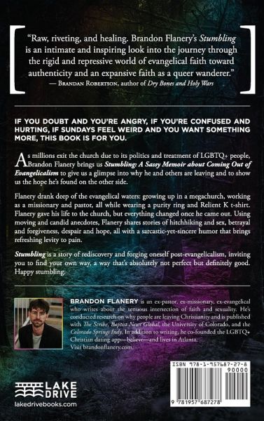 "Honest, vulnerable, delightful and disturbing." -David Hayward, NakedPastor If you doubt and you're angry, if you're confused and hurting, if Sundays feel weird and you want something more, this book is for you. As millions exit the church due to its politics and treatment of LGBTQ people, Brandon Flanery brings us Stumbling: A Sassy Memoir about Coming Out of Evangelicalism, an LGBTQ memoir that gives us a glimpse into why he and others are leaving and to show us the hope he's found on the other side. Flanery drank deep of the evangelical waters: growing up in a megachurch, working as a missionary and pastor, all while wearing a purity ring and Relient K t-shirt. Flanery gave his life to the church, but everything changed once he came out. Using moving and candid anecdotes, Flanery shares stories of hitchhiking and sex, betrayal and forgiveness, despair and hope, all with a sarcastic-yet-sincere humor that brings refreshing levity to pain. Stumbling is a story of rediscovery and forging oneself after Christian deconstruction, inviting you to find your own way, a way that's absolutely not perfect but definitely good. Happy stumbling.