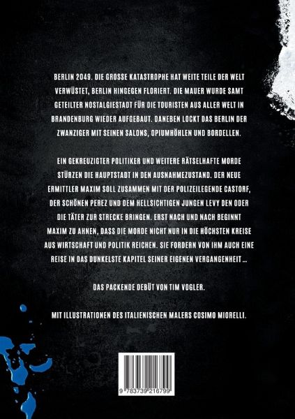 Ein gekreuzigter Politiker und weitere rätselhafte Morde stürzen die Hauptstadt in den Ausnahmezustand. Der neue Ermittler Maxim soll zusammen mit der Polizeilegende Castorf, der schönen Perez und dem hellsichtigen Jungen Levy den oder die Täter zur Strecke bringen. Nach und nach versteht Maxim, dass die Morde nicht nur in die höchsten Kreise aus Wirtschaft und Politik reichen. Sie fordern von ihm auch eine Reise in das dunkelste Kapitel seiner eigenen Vergangenheit. Eine wilde Jagd durch das zerrissene und abseitige Berlin des Jahres 2049 beginnt ... Das packende Debüt von Tim Vogler. Mit Illustrationen des italienischen Malers Cosimo Miorelli.