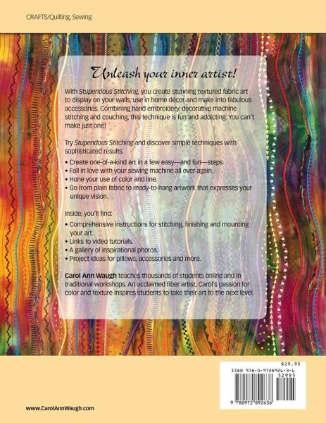 Unleash your inner artist! With Stupendous Stitching, you create stunning textured fabric art to display on your walls, use in home decor, and make into fabulous accessories. Combining hand embroidery, decorative machine stitching and couching, this technique is fun and addicting. You can't just make one! Try Stupendous Stitching and discover simple techniques with sophisticated results.Create one-of-a-kind art in a few easy-and fun-steps. Fall in love with your sewing machine all over again. Hone your use of color and line. Go from plain fabric to ready-to-hang artwork that expresses your unique vision. Inside, you'll find:Comprehensive instructions for stitching, finishing and mounting your art. Links to video tutorials. A gallery of inspirational photos. Project ideas for pillows, accessories and more. Carol Ann Waugh teaches thousands of students online and in traditional workshops. An acclaimed fiber artist, Carol's passion for color and texture inspires students to take their art to the next level.