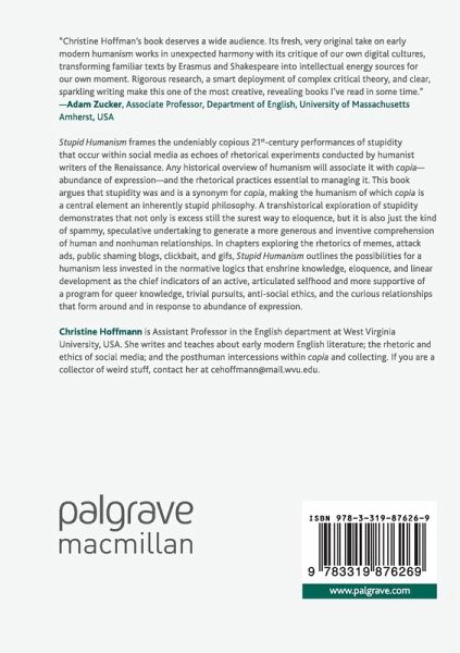 This book frames the undeniably copious 21st-century performances of stupidity that occur within social media as echoes of rhetorical experiments conducted by humanist writers of the Renaissance. Any historical overview of humanism will associate it with copia-abundance of expression-and the rhetorical practices essential to managing it. This book argues that stupidity was and is a synonym for copia, making the humanism of which copia is a central element an inherently stupid philosophy. A transhistorical exploration of stupidity demonstrates that not only is excess still the surest way to eloquence, but it is also just the kind of spammy, speculative undertaking to generate a more generous and inventive comprehension of human and nonhuman relationships. In chapters exploring the rhetorics of memes, attack ads, public shaming blogs, clickbait and gifs, Stupid Humanism outlines the possibilities for a humanism less invested in the normative logics that enshrine knowledge, eloquence and linear development as the chief indicators of an active, articulated selfhood and more supportive of a program for queer knowledge, trivial pursuits, anti-social ethics and the curious relationships that form around and in response to abundance of expression.