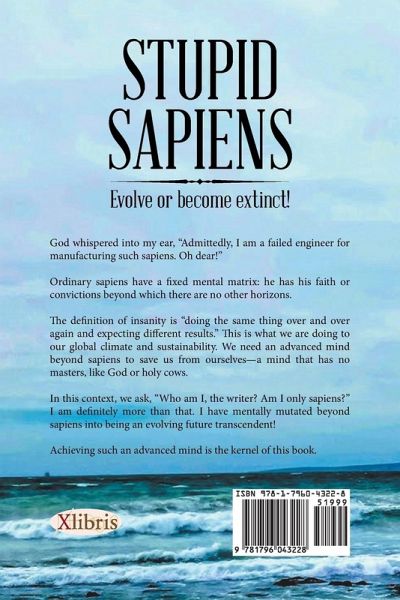 God whispered into my ear, "Admittedly, I am a failed engineer for manufacturing such sapiens. Oh dear!" Ordinary sapiens have a fixed mental matrix: he has his faith or convictions beyond which there are no other horizons. The definition of insanity is "doing the same thing over and over again and expecting different results." This is what we are doing to our global climate and sustainability. We need an advanced mind beyond sapiens to save us from ourselves-a mind that has no masters, like God or holy cows. In this context, we ask, "Who am I, the writer? Am I only sapiens?" I am definitely more than that. I have mentally mutated beyond sapiens into being an evolving future transcendent! Achieving such an advanced mind is the kernel of this book.