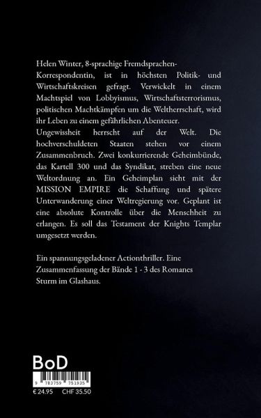 Helen Winter, 8-sprachige Fremdsprachen-Korrespondentin, ist in höchsten Politik- und Wirtschaftskreisen gefragt. Verwickelt in einem Machtspiel von Lobbyismus, Wirtschaftsterrorismus, politischen Machtkämpfen um die Weltherrschaft, wird ihr Leben zu einem gefährlichen Abenteuer. Ungewissheit herrscht auf der Welt. Die hoch verschuldeten Staaten stehen vor einem Finanzkollaps. Ein nie dagewesener Cyberkrieg tobt. Zwei konkurrierende Geheimbunde, das Kartell 300 und das Syndikat, streben eine neue Weltordnung an. Ein Geheimplan sieht mit der MISSION EMPIRE die Schaffung und spätere Unterwanderung einer Weltregierung vor. Vorgesehen ist die absolute Kontrolle. Das Testament der Sinclairs ist das Testament der Knights Templar. Mit der Operation STURM ist die Menschheit einem unvorstellbaren Erpressungsszenario ausgesetzt. Ein spannungsgeladener Actionthriller. Eine Zusammenfassung der Bände 1 - 3 des Romanes Sturm im Glashaus.