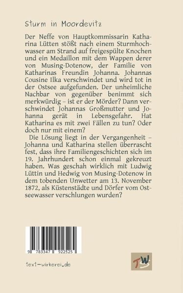 Das Buch spielt auf zwei Zeitebenen: einmal heute und einmal im Jahr 1872. Die Kapitel wechseln sich jeweils ab und sind relativ kurz, man switcht also ständig hin und her. Das fiel mir jedoch nicht schwer, diese schnellen Wechsel fand ich gelungen, weil ich so nahezu zeitgleich beide Geschichten erleben konnte. Und ich weiß gar nicht, welche mir besser gefallen hat: die von heute oder die historische. Die heutige schön humorvoll, die historische sehr ergreifend. Die historischen Kapitel haben einen Auszug aus der damaligen Zeitung vorneweg, in dieser nicht ganz so leicht zu lesenden altdeutschen Schrift. Es gibt auch einige hübsche s/w-Illustrationen aus der Gegend. Der Schreibstil ist sehr gut zu lesen, lebendig und bildhaft. Ich hatte die ganze Zeit einen Film vor Augen. Es handelt sich um den 2. Band dieser Reihe. Band 1 kenne ich nicht, ich hatte aber nicht das Gefühl, dass mir was fehlte. Was die Handlung betrifft: man könnte sich jetzt drüber streiten, ob die Polizei wirklich so vorgehen würde, wie das hier der Fall war und ob das alles so Hand und Fuß hatte. Aber nein, ich streite darüber nicht. Denn mir hat es so wie es ist gefallen. Netter, humorvoller Krimi, bewegender historischer Teil, bildhafte Figuren und im hinteren Teil dann noch Fakten zum Sturmhochwasser 1872, ein Glossar mit Erklärungen zu den im Buch vorkommenden, vielleicht teilweise nicht ganz bekannten (zum Teil plattdeutschen) Begriffen und eine Karte der fiktiven Gegend um Moordevitz . Was will man mehr? Sehr gute 4/5 Sterne.