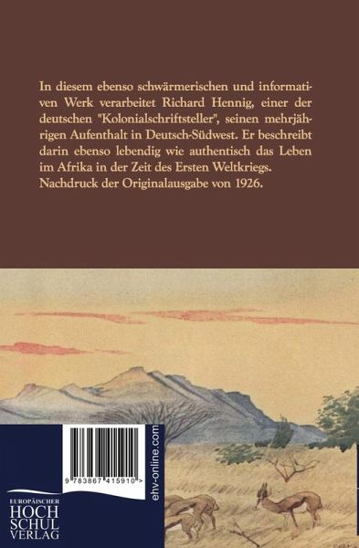 In diesem ebenso schwärmerischen und informativen Werk verarbeitet Richard Hennig, einer der deutschen "Kolonialschriftsteller", seinen mehrjährigen Aufenthalt in Deutsch-Südwest. Er beschreibt darin ebenso lebendig wie authentisch das Leben im Afrika in der Zeit des Ersten Weltkriegs.