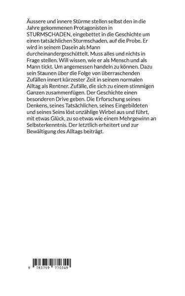 Äussere und innere Stürme stellen selbst den in die Jahre gekommenen Protagonisten in STURMSCHADEN, eingebettet in die Geschichte um einen tatsächlichen Sturmschaden, auf die Probe. Er wird in seinem Dasein als Mann durcheinandergeschüttelt. Muss alles und nichts in Frage stellen. Will wissen, wie er als Mensch und als Mann tickt. Um angemessen handeln zu können. Dazu sein Staunen über die Folge von überraschenden Zufällen innert kürzester Zeit in seinem normalen Alltag als Rentner. Zufälle, die sich zu einem stimmigen Ganzen zusammenfügen. Der Geschichte einen besonderen Drive geben. Die Erforschung seines Denkens, seines Tatsächlichen, seines Eingebildeten und seines Seins löst unzählige Wirbel aus und führt, mit etwas Glück, zu so etwas wie einem Mehrgewinn an Selbsterkenntnis. Der letztlich erheitert und zur Bewältigung des Alltags beiträgt.