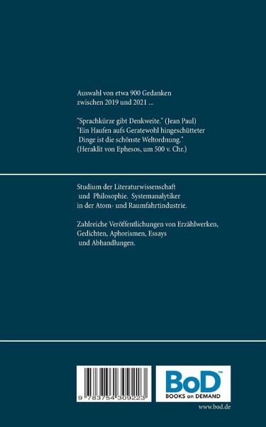Auswahl von etwa 900 Gedanken zwischen 2019 und 2021. - ´Sprachkürze gibt Denkweite.´ (Jean Paul)- ´Ein Haufen aufs Geratewohl hinge-schütt-eter Dinge ist die schönste Weltordnung.` (Heraklit, um 500 v. Chr.)- `Der Aphorismus ist nur aus seiner Stellung zwischen Philosophie und Poesie beschreibbar.´ (Stefan Fedler).- Europäische Moralisten´waren keine Moralprediger, sondern Essayisten und Aphoristiker, die seit dem 17. Jahrhundert die ´mores´ untersuchten, die Sitten und Gebräuche ihrer Epochen. Diese seither leider fast abgerissene Tradition sollte hier etwas wiederbelebt werden ...