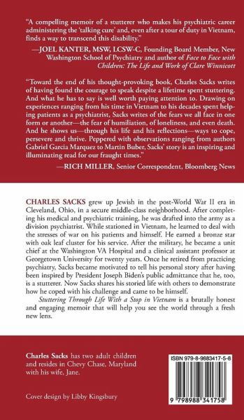 Charles Sacks grew up Jewish in the post-World War II era in Cleveland, Ohio, in a secure middle-class neighborhood. After completing his medical and psychiatric training, he was drafted into the army as a division psychiatrist. While stationed in Vietnam, he learned to deal with the stresses of war on his patients and himself. He earned a bronze star with oak leaf cluster for his service. After the military, he became a unit chief at the Washington VA Hospital and a clinical assistant professor at Georgetown University for twenty years. Once he retired from practicing psychiatry, Sacks became motivated to tell his personal story after having been inspired by President Joseph Biden's public admittance that he, too, is a stutterer. Now Sacks shares his storied life with others to demonstrate how he coped with his challenge and came to be himself. Stuttering Through Life With a Stop in Vietnam is a brutally honest and engaging memoir that will help you see the world through a fresh new lens.