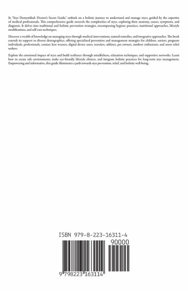 In "Stye Demystified: Doctor's Secret Guide," embark on a holistic journey to understand and manage styes, guided by the expertise of medical professionals. This comprehensive guide unravels the complexities of styes, exploring their anatomy, causes, symptoms, and diagnosis. It delves into traditional and holistic prevention strategies, encompassing hygiene practices, nutritional approaches, lifestyle modifications, and self-care techniques. Discover a wealth of knowledge on managing styes through medical interventions, natural remedies, and integrative approaches. The book extends its support to diverse demographics, offering specialized prevention and management strategies for children, seniors, pregnant individuals, professionals, contact lens wearers, digital device users, travelers, athletes, pet owners, outdoor enthusiasts, and stress relief seekers. Explore the emotional impact of styes and build resilience through mindfulness, relaxation techniques, and supportive networks. Learn how to create safe environments, make eye-friendly lifestyle choices, and integrate holistic practices for long-term stye management. Empowering and informative, this guide illuminates a path towards stye prevention, relief, and holistic well-being.