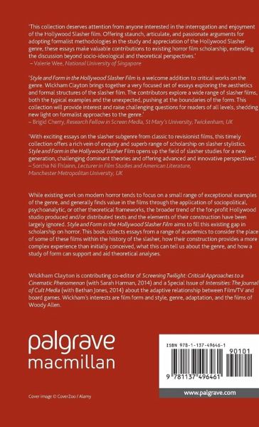 'Style and Form in the Hollywood Slasher Film is a welcome addition to critical works on the genre. Wickham Clayton brings together a very focused set of essays exploring the aesthetics and formal structures of the slasher film. The contributors explore a wide range of slasher films, both the typical examples and the unexpected, pushing at the boundaries of the form. This collection will provide interest and raise challenging questions for readers of all levels, shedding new light on formalist approaches to the genre.' Brigid Cherry, Research Fellow in Screen Media, St Mary's University, Twickenham