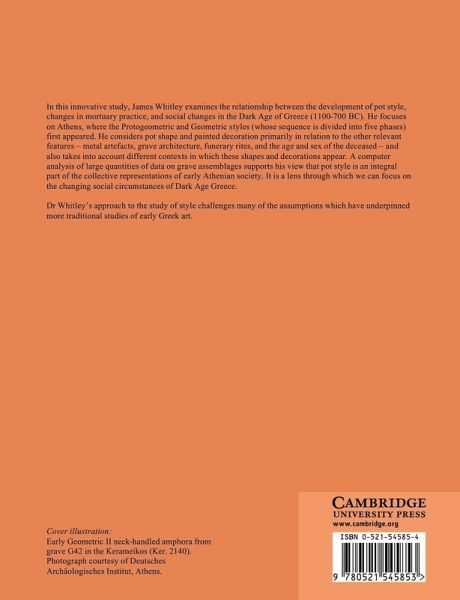 In this innovative study, James Whitley examines the relationship between the development of pot style and social changes in the Dark Age of Greece (1100-700 BC). He focuses on Athens where the Protogeometric and Geometric styles first appeared. He considers pot shape and painted decoration primarily in relation to the other relevant features - metal artefacts, grave architecture, funerary rites, and the age and sex of the deceased - and also takes into account different contexts in which these shapes and decorations appear. A computer analysis of grave assemblages supports his view that pot style is an integral part of the collective representations of Early Athenian society. It is a lens through which we can focus on the changing social circumstances of Dark Age Greece. Dr Whitley's approach to the study of style challenges many of the assumptions which have underpinned more traditional studies of Early Greek art.