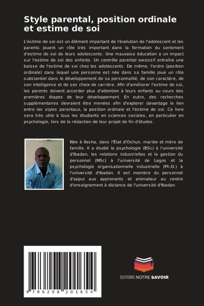 L'estime de soi est un élément important de l'évolution de l'adolescent et les parents jouent un rôle très important dans la formation du sentiment d'estime de soi de leurs adolescents. Une mauvaise éducation a un impact sur l'estime de soi des enfants. Un contrôle parental excessif entraîne une baisse de l'estime de soi chez les adolescents. De même, l'ordre (position ordinale) dans lequel une personne est née dans sa famille joue un rôle substantiel dans le développement de sa personnalité, de son caractère, de son intelligence et de ses choix de carrière. Afin d'améliorer l'estime de soi, les parents doivent accorder plus d'attention à leurs enfants au cours des premières étapes de leur développement. En outre, des recherches supplémentaires devraient être menées afin d'explorer davantage le lien entre les styles parentaux, la position ordinale et l'estime de soi. Ce livre sera très utile à tous les étudiants en sciences sociales, en particulier en psychologie, lors de la rédaction de leur projet de fin d'études.