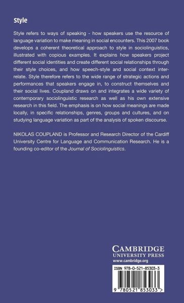 Style refers to ways of speaking - how speakers use the resource of language variation to make meaning in social encounters. This 2007 book develops a coherent theoretical approach to style in sociolinguistics, illustrated with copious examples. It explains how speakers project different social identities and create different social relationships through their style choices, and how speech-style and social context inter-relate. Style therefore refers to the wide range of strategic actions and performances that speakers engage in, to construct themselves and their social lives. Coupland draws on and integrates a wide variety of contemporary sociolinguistic research as well as his own extensive research in this field. The emphasis is on how social meanings are made locally, in specific relationships, genres, groups and cultures, and on studying language variation as part of the analysis of spoken discourse.