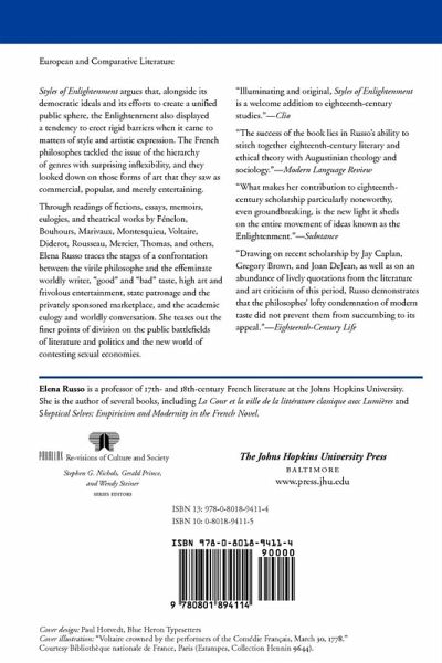 Styles of Enlightenment argues that alongside its democratic ideals and its efforts to create a unified public sphere, the Enlightenment also displayed a tendency to erect rigid barriers when it came to matters of style and artistic expression. The French philosophes tackled the issue of the hierarchy of genres with surprising inflexibility, and they looked down on those forms of art that they saw as commercial, popular, and merely entertaining. They were convinced that the standard of taste was too important a matter to be left to the whims of the public and the vagaries of the marketplace: aesthetic judgment ought to belong to a few, enlightened minds who would then pass it on to the masses. Through readings of fictions, essays, memoirs, eulogies, and theatrical works by Fénelon, Bouhours, Marivaux, Montesquieu, Voltaire, Diderot, Rousseau, Mercier, Thomas, and others, Styles of Enlightenment traces the stages of a confrontation between the virile philosophe and the effeminate worldly writer, "good" and "bad" taste, high art and frivolous entertainment, state patronage and the privately sponsored marketplace, the academic eulogy and worldly conversation. It teases out the finer points of division on the public battlefields of literature and politics and the new world of contesting sexual economies.