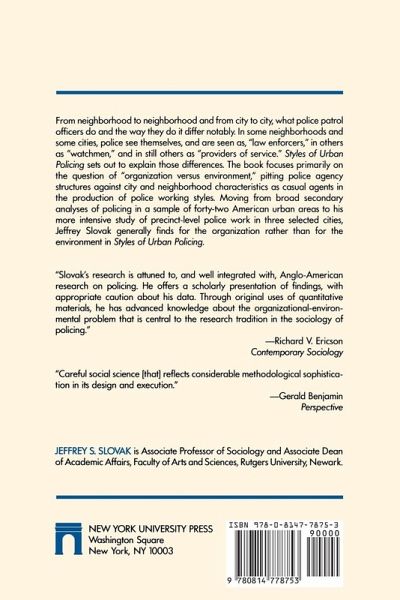 Using data from 42 sizable American cities on their environments and police organizational structures, the book documents the importance of organizational structure on police action by predicting arrest rates for 2 types of serious criminal offenses. It applies this research perspective to neighborhoods in analyses of policing styles in three cities: Elyria, Ohio; Columbia, S.C.; and Newark, N.J. The study examines the kinds of data on police action available from a police dispatch log, as well as particular information recording processes used in the three sites. Two key indicators of police style are the rate of police aggressiveness and the degree to which local police work is legalistic, watchmanlike, or service-oriented. These measures are used to analyze variations in policing styles across both neighborhoods and cities, providing support to the theory that organization rather than environment determines local policing styles. This view receives additional support from indepth analyses of social, demographic, and economic characteristics of the three sites. Tables, references, and index.