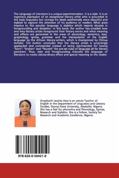 The Language of Literature is a unique experimentation. It is a style. It is an ingenious expression of an exceptional literary artist who is grounded in the basic linguistics but conveys his ideals aesthetically more beautiful and stylized to capture the attention of his audience or readers. What gives impetus to this peculiar language is stylistics which majorly situates in foregrounding and deviation. In this book, the author has unveiled how and why literary artists foreground their literary works and what meaning and effects are generated in the areas of phonology, semantics, lexis, graphology, syntax, grammar and the manipulation of the English language by the African literary writers, which is championed by Chinua Achebe. The Author concludes that the literary artists is surprisingly applauded and commended instead of being reprimanded for having "bent"; "broken" and "flouted" the pre-set rules of language all for literary penchant. Thus, style and foregrounding intensify the language of literature to create extraordinary effect and special meaning to the reader.