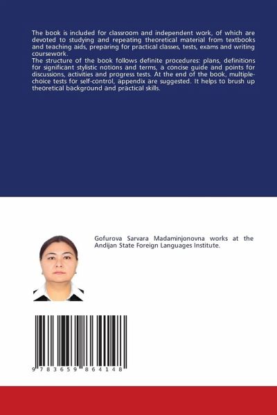 The b k is included f r cl ssr m nd independent w rk, f which re dev ted t studying nd repe ting the retic l m teri l fr m textb ks nd te ching ids, prep ring f r pr ctic l cl sses, tests, ex ms nd writing c ursew rk. The structure f the b k f ll ws definite pr cedures: pl ns, definiti ns f r signific nt stylistic n ti ns nd terms, c ncise guide nd p ints f r discussi ns, ctivities nd pr gress tests. t the end f the b k, multiple-ch ice tests f r self-c ntr l, ppendix re suggested. It helps t brush up the retic l b ckgr und nd pr ctic l skills.